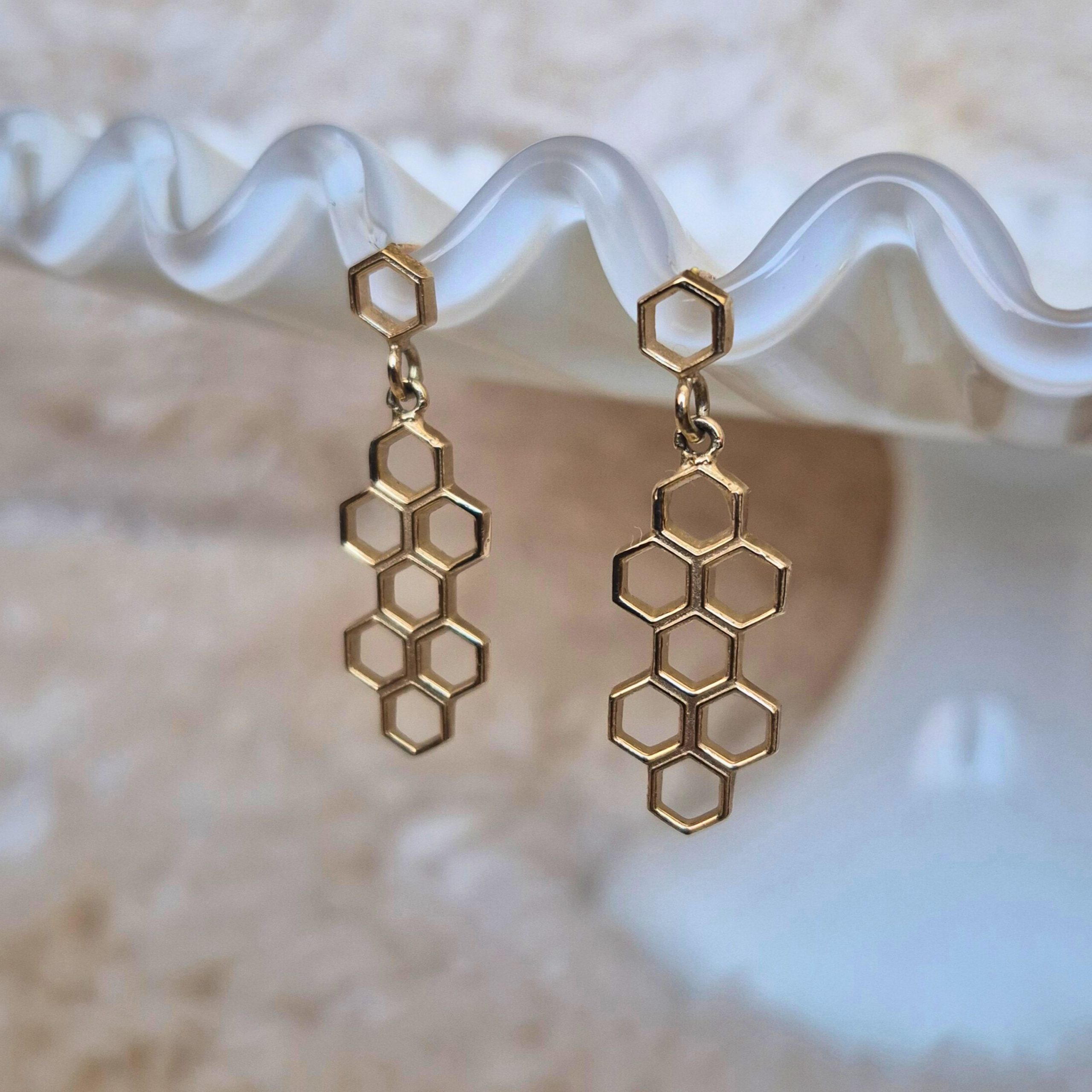 The sweet symmetry of Lucina K’s Honey Bee Collection – these 14K gold Long Honey Earrings. Inspired by nature’s honeycomb, their cascading hexagonal links dangle delicately, blending modern minimalism with organic charm—ideal for infusing everyday style with a golden buzz of elegance.